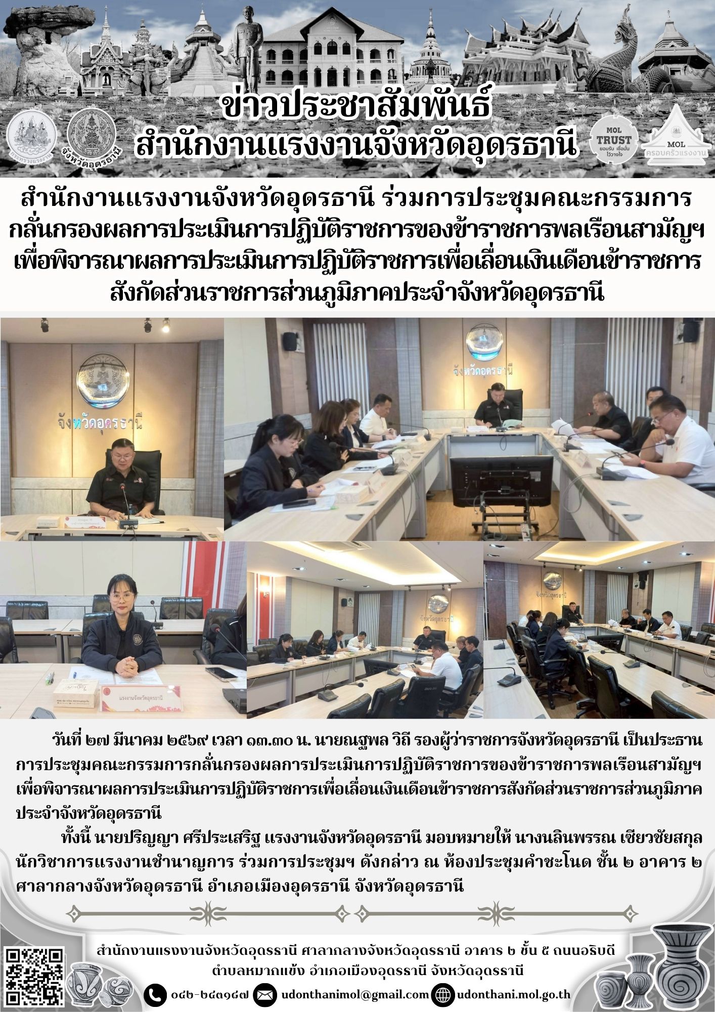 สำนักงานแรงงานจังหวัดอุดรธานี ร่วมการประชุมคณะกรรมการ กลั่นกรองผลการประเมินการปฏิบัติราชการของข้าราชการพลเรือนสามัญฯ เพื่อพิจารณาผลการประเมินการปฏิบัติราชการเพื่อเลื่อนเงินเดือนข้าราชการสังกัดส่วนราชการส่วนภูมิภาคประจำจังหวัดอุดรธานี