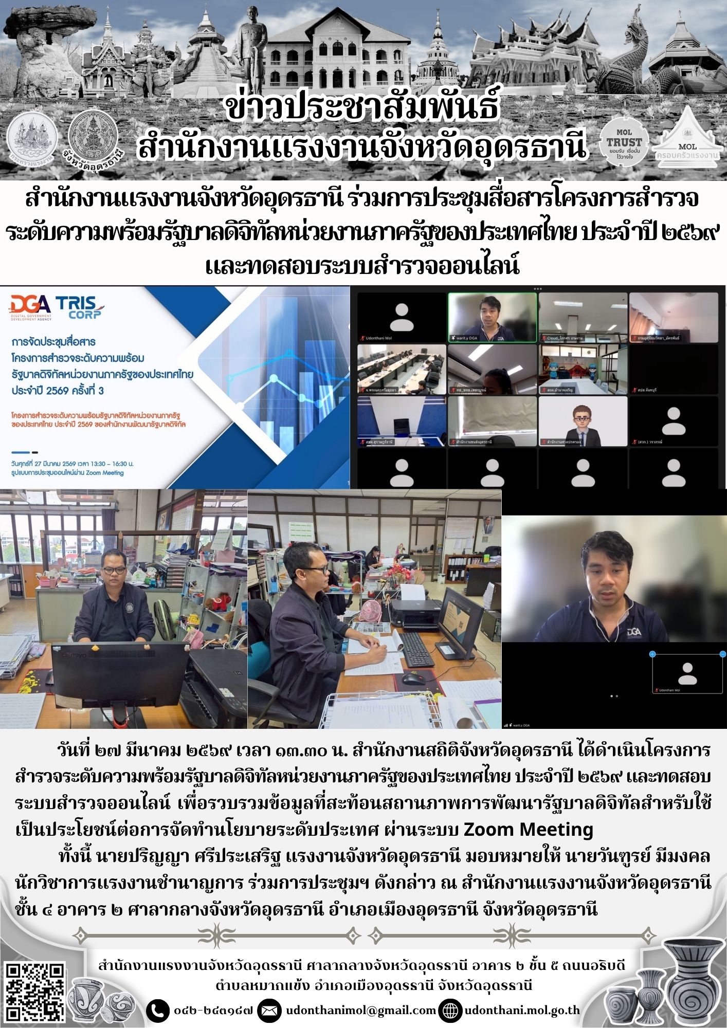 สำนักงานแรงงานจังหวัดอุดรธานี ร่วมการประชุมสื่อสารโครงการสำรวจ ระดับความพร้อมรัฐบาลดิจิทัลหน่วยงานภาครัฐของประเทศไทย ประจำปี ๒๕๖๙ และทดสอบระบบสำรวจออนไลน์