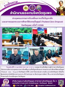 แรงงานจังหวัดชุมพร พร้อมด้วยผู้แทนหน่วยงานในสังกัดกระทรวงแรงงาน ร่วมประชุมคณะกรรมการขับเคลื่อนการแก้ไขปัญหาเด็ก และเยาวชนนอกระบบการศึกษาให้กลายเป็นศูนย์ (Thailand Zero Dropout) จังหวัดชุมพร ครั้งที่ 1/2569