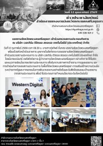 แรงงานจังหวัดพระนครศรีอยุธยา เข้าร่วมตรวจสถานประกอบกิจการ ณ บริษัท เวสเทิร์น ดิจิตอล สตอเรจ เทคโนโลยีส์ (ประเทศไทย) จำกัด