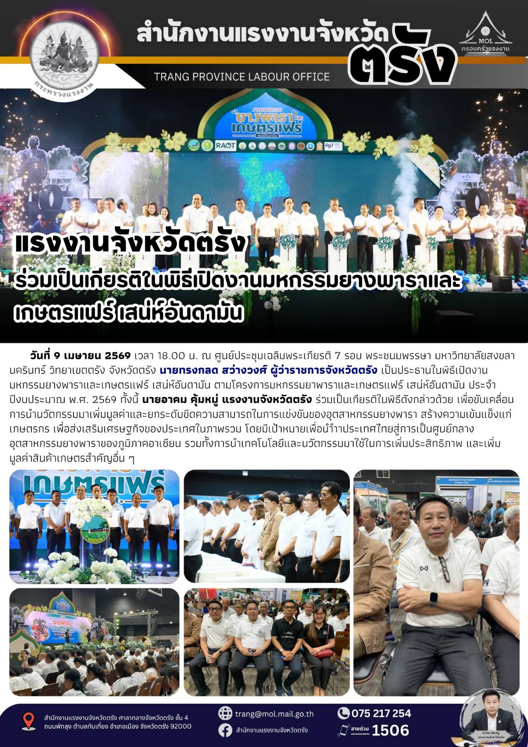 แรงงานจังหวัดตรัง ร่วมเป็นเกียรติในพิธีเปิดงานมหกรรมยางพาราและเกษตรแฟร์ เสน่ห์อันดามัน
