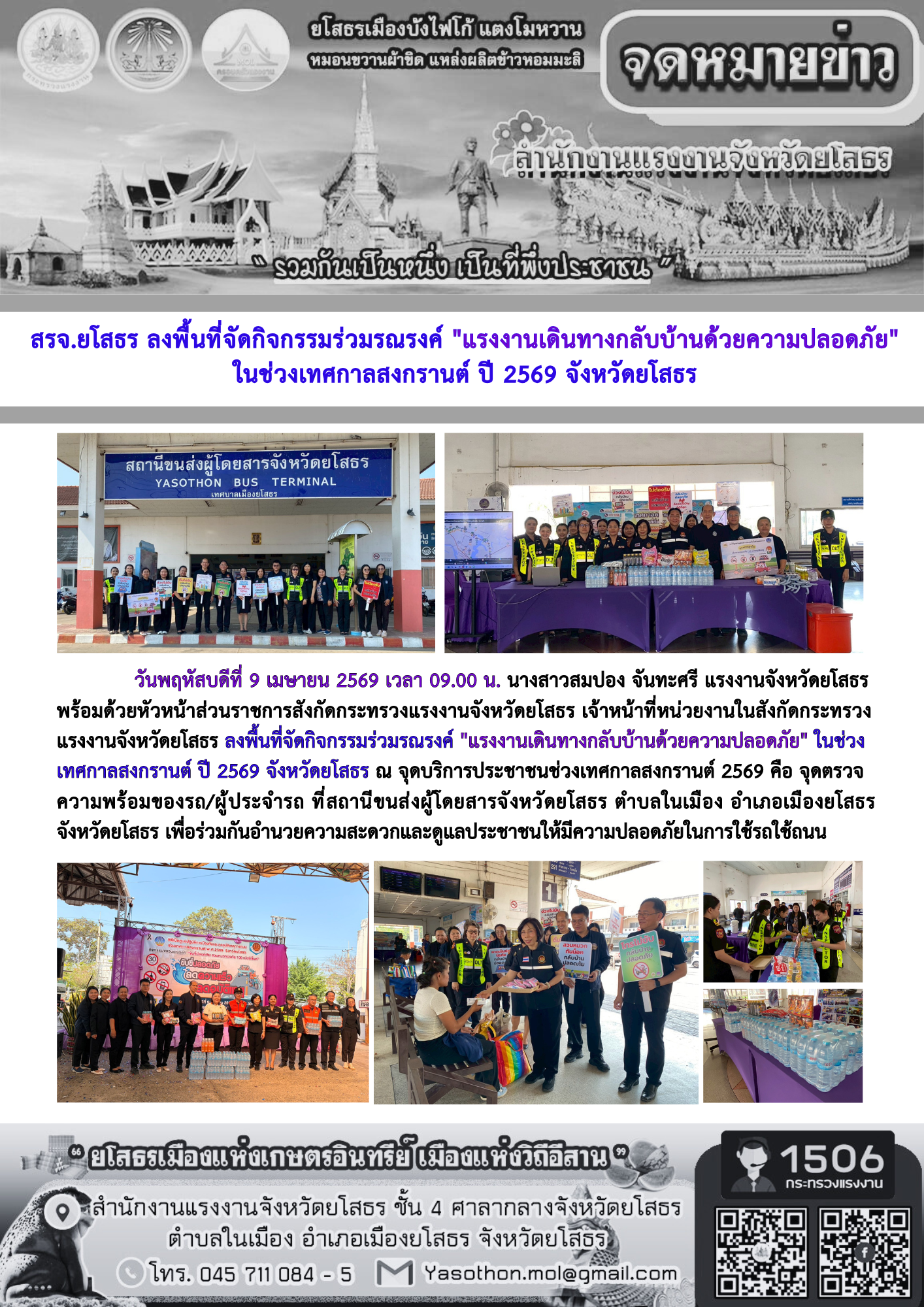 สรจ.ยโสธร ลงพื้นที่จัดกิจกรรมร่วมรณรงค์ “แรงงานเดินทางกลับบ้านด้วยความปลอดภัย” ในช่วงเทศกาลสงกรานต์ ปี 2569 จังหวัดยโสธร
