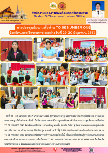 วันที่ 29 – 30 มิถุนายน 2567 นางสาวนราภรณ์ สุวรรณประเสริฐ แรงงานจังหวัดนครศรีธรรมราช พร้อมด้วยนางสาวชญาน์นันท์ เสตะพันธ์ นักวิชาการแรงงานชำนาญการพิเศษ เข้าร่วมการประชุมสัมนาเครือข่าย TO BE NUMBER ONE จังหวัดนครศรีธรรมราชโดยมีภญ.หมอผึ้ง นันทวัน วิเชียร ผู้ช่วยนายแพทย์สาธารณสุขจังหวัดนครศรีธรรมราช เป็นประธานเปิดประชุม พร้อมด้วย ผู้รับผิดชอบในการขับเคลื่อนอำเภอ และชมรม TO BE NUMBER ONE จังหวัดนครศรีธรรมราช เข้าร่วมการประชุม เพื่อแลกเปลี่ยนเรียนรู้การดำเนินงาน/การนำเสนอผลการดำเนินงาน และวางแผนการดำเนินงาน TO BE NUMBER ONE ชมรม TO BE NUMBER ONE ในจังหวัดนครศรีธรรมราช ณ โรงแรมขนอมซันไรส์ อำเภอขนอม