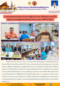 วันพุธที่ 26 มิถุนายน 2567 เวลา 09.30 น. นางสาวนราภรณ์ สุวรรณประเสริฐ แรงงานจังหวัดนครศรีธรรมราช ได้มอบหมายให้นางสาวชญาน์นันท์ เสตะพันธ์ นักวิชาการแรงงานชำนาญการพิเศษ เข้าร่วมประชุมคณะกรรมการร่วมภาครัฐและเอกชน เพื่อพัฒนาและแก้ไขปัญหาทางเศรษฐกิจของจังหวัด (กรอ.จว.นศ.) ครั้งที่ 6/2567
