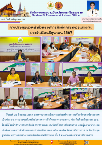 วันพุธที่ 26 มิถุนายน 2567 นางสาวนราภรณ์ สุวรรณประเสริฐ แรงงานจังหวัดนครศรีธรรมราช เป็นประธานการประชุมหัวหน้าส่วนราชการสังกัดกระทรวงแรงงาน ประจำเดือนมิถุนายน 2567 โดยมีหัวหน้าส่วนราชการสังกัดกระทรวงแรงงานจังหวัดนครศรีธรรมราช และผู้แทนหน่วยงาน เพื่อติดตาม ณ ห้องประชุมศูนย์อำนวยการกระทรวงแรงงานจังหวัดนครศรีธรรมราช ชั้น 2