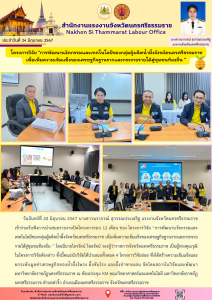 วันจันทร์ที่ 24 มิถุนายน 2567 เวลา 09.00 น. นางสาวนราภรณ์ สุวรรณประเสริฐ แรงงานจังหวัดนครศรีธรรมราช เข้าร่วมรับฟังการนำเสนอรายงานปิดโครงการรอบ 12 เดือน ของ โครงการวิจัย “การพัฒนานวัตกรรมและเทคโนโลยีของกลุ่มผู้ผลิตน้ำผึ้งจังหวัดนครศรีธรรมราช เพื่อเพิ่มความเข้มแข็งของเศรษฐกิจฐานรากและกระจายรายได้สู่ชุมชนท้องถิ่น “ ณ ห้องประชุม KM คณะวิทยาศาสตร์และเทคโนโลยี มหาวิทยาลัยราชภัฏนครศรีธรรมราช ตำบลท่างิ้ว อำเภอเมือง จังหวัดนครศรีธรรมราช