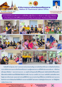 วันจันทร์ที่ 24 มิถุนายน 2567 นางสาวนราภรณ์ สุวรรณประเสริฐ แรงงานจังหวัดนครศรีธรรมราช พร้อมด้วยหัวหน้าส่วนราชการสังกัดกระทรวงแรงงานจังหวัดนครศรีธรรมราช และผู้แทนหน่วยงาน ลงพื้นที่ดำเนินงานตามนโยบาย “หนึ่งตำบล หนึ่งกลุ่มอาชีพอิสระ” ของกระทรวงแรงงาน ณ กลุ่มวิสาหกิจชุมชนเพ็ชรคีรีโฮมสเตย์ (ผลิตภัณฑ์เพ็ชรคีรีคอสเมติก)