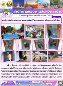 สรจ.ลำปาง จัดกิจกรรมจิตอาสาทำความสะอาดห้องน้ำวัดในชุมชน โดยอาสาสมัครแรงงานร่วมใจพัฒนา ครั้งที่ 2 เฉลิมพระเกียรติพระบาทสมเด็จพระเจ้าอยู่หัว เนื่องในโอกาสพระราชพิธีมหามงคลเฉลิมพระชนมพรรษา 6 รอบ 28 กรกฎาคม 2567 ประจำปีงบประมาณ พ.ศ. 2567