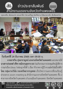 เจ้าหน้าที่สำนักงานแรงงานจังหวัดกำแพงเพชร ร่วมกิจกรรมการประชุมเชิงปฏิบัติการ การเล่าเรื่อง (Story Telling) ครั้งที่ 1 เรื่อง “ข้าราชการรู้ไว้ ความผิดวินัยมีใกล้ตัว” ผ่านระบบออนไลน์