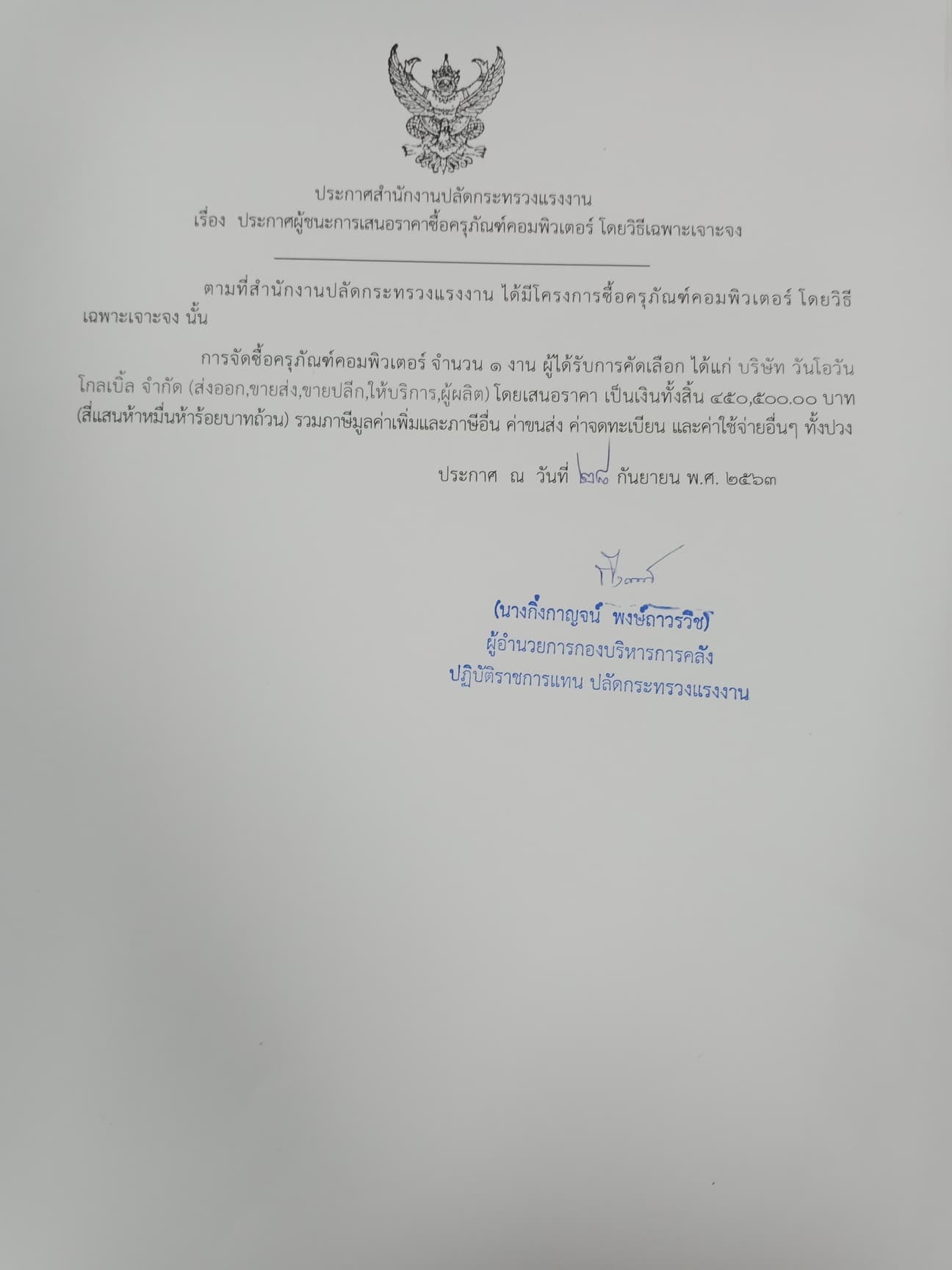 ประกาศผู้ชนะการเสนอราคา จ้างเหมาบริการจัดทำข้อมูลภาษาอังกฤษของเว็บไซต์กระทรวงแรงงาน โดยวิธีเฉพาะเจาะจง |