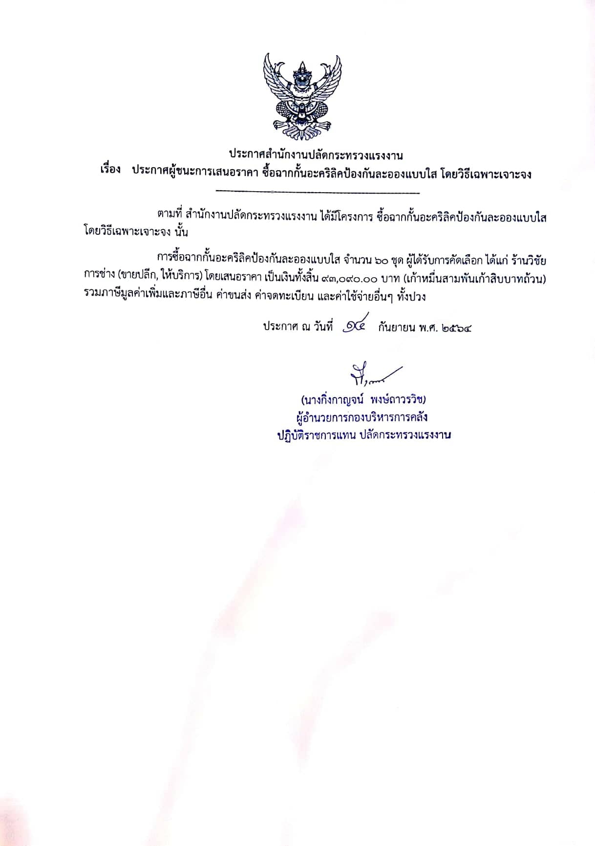 ประกาศผู้ชนะการเสนอราคา ซื้อฉากกั้นอะคริลิคป้องกันละอองแบบใส โดยวิธีเฉพาะเจาะจง