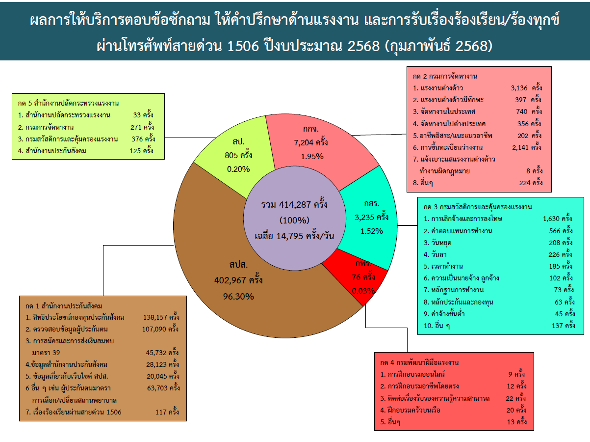 ผลการให้บริการตอบข้อซักถาม ให้คำปรึกษาด้านแรงงาน และการรับเรื่องร้องเรียน/ร้องทุกข์ ผ่านโทรศัพท์สายด่วน 1506 รายเดือนกุมภาพันธ์ 2568