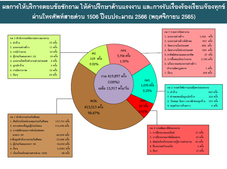 ผลการให้บริการตอบข้อซักถาม ให้คำปรึกษาด้านแรงงานและการรับเรื่องร้องเรียนร้องทุกข์ ผ่านโทรศัพท์สายด่วน 1506 รายเดือนเมษายน 2567